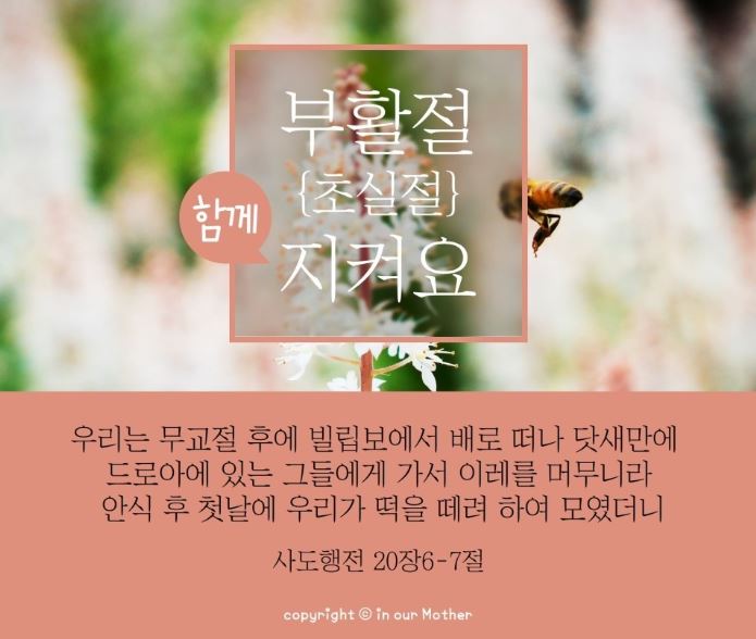 사도행전 20장 6~7절 우리는 무교절 후에 빌립보에서 배로 떠나 닷새만에 드로아에 있는 그들에게 가서 이레를 머무니라 안식 후 첫날에 우리가 떡을 떼려 하여 모였더니