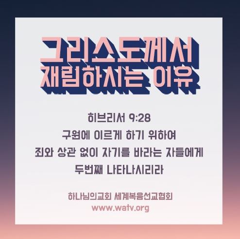 예수님께서는 다시 오신다고 약속하셨습니다(히9:28). 그렇다면 어떤 모습으로 오시며, 어디에 오시며, 언제 오실까요? 아무것도 모른 채 막연히 기다리기만 하면 되는 것일까요? 아닙니다. 그리스도께서는 육체의 모습으로 다시 오십니다. 거짓교회와 거짓목사들이 성경을 교묘하게 해석하여 그리스도를 알아보지 못하게 혼란을 가중시키고 있죠. 아래의 내용을 자세히 읽어보십시오.