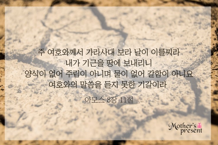 아모스 8장 11절 주 여호와께서 가라사대 보라 날이 이를찌라 내가 기근을 땅에 보내리니 양식이 없어 주림이 아니며 물이 없어 갈함이 아니요 ①여호와의 말씀을 듣지 못한 기갈이라. 사람이 이 바다에서 저 바다까지, 북에서 동까지 비틀거리며 ②여호와의 말씀을 구하려고 달려 왕래하되 얻지 못하리니 그 날에 아름다운 처녀와 젊은 남자가 다 갈하여 피곤하리라.