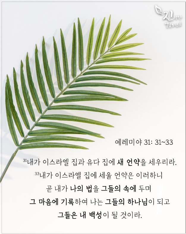 | 예레미야 31장 31절 나 여호와가 말하노라 보라 날이 이르리니 내가 이스라엘 집과 유다 집에 새 언약을 세우리라 |