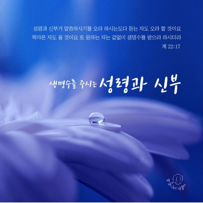 계 22:17 성령과 신부가 말씀하시기를 오라 하시는도다 듣는 자도 오라 할 것이요 목마른 자도 올 것이요 또 원하는 자는 값 없이 생명수를 받으라 하시더라