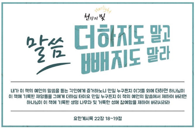 | 계 22:18 내가 이 책의 예언의 말씀을 듣는 각인에게 증거하노니 만일 누구든지 이것들 외에 더하면 하나님이 이 책에 기록된 재앙들을 그에게 더하실 터이요 신 4:2 내가 너희에게 명하는 말을 너희는 가감하지 말고 |