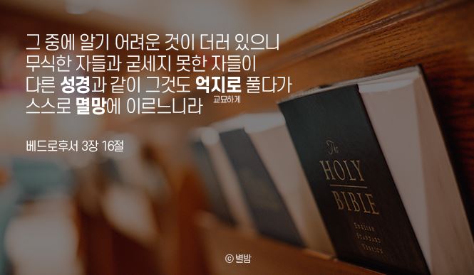 | 벧후 3:16 그 중에 알기 어려운 것이 더러 있으니 무식한 자들과 굳세지 못한 자들이 다른 성경과 같이 그것도 억지로 풀다가 스스로 멸망에 이르느니라 |
